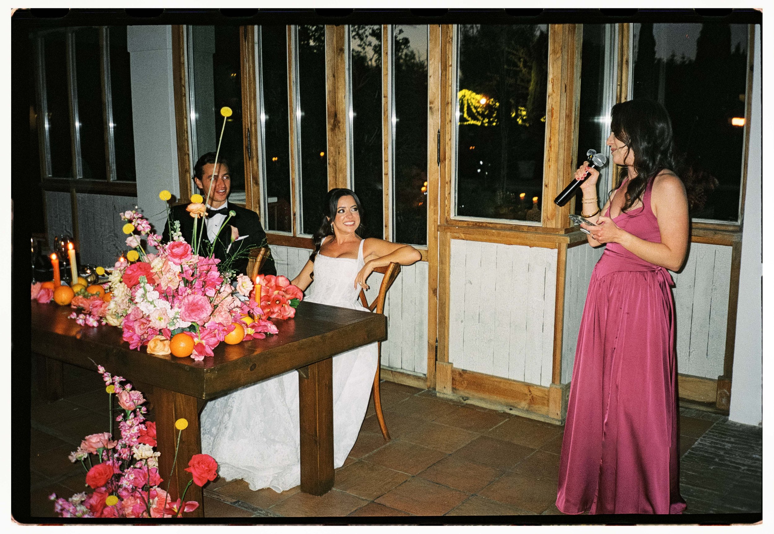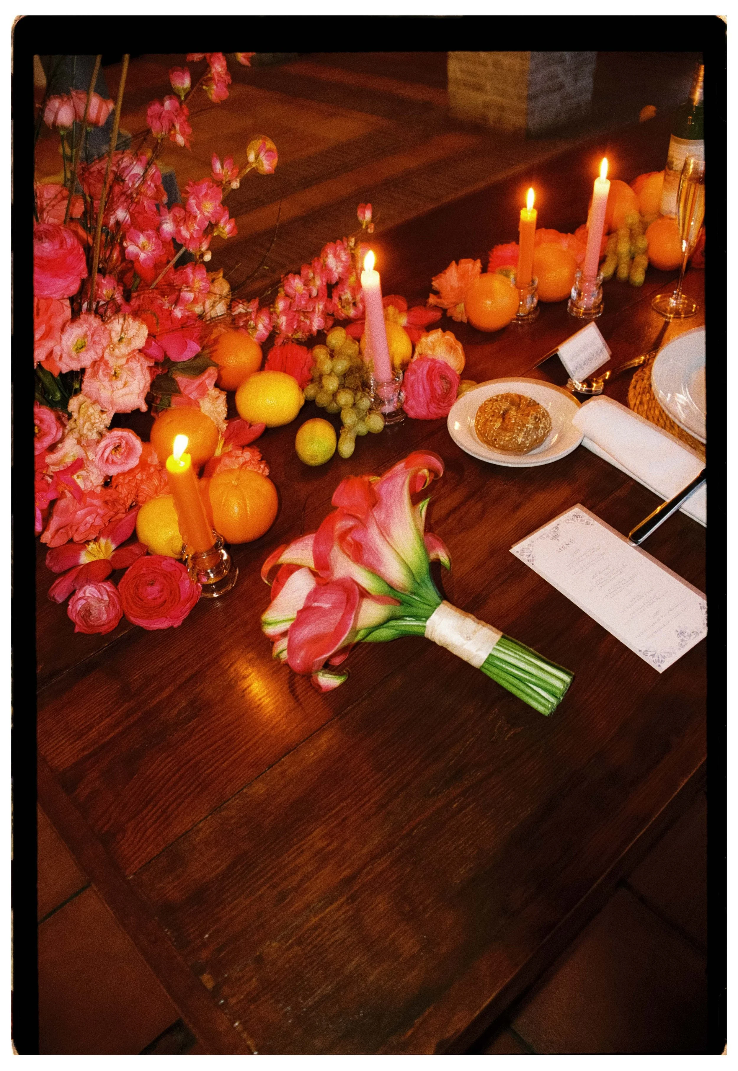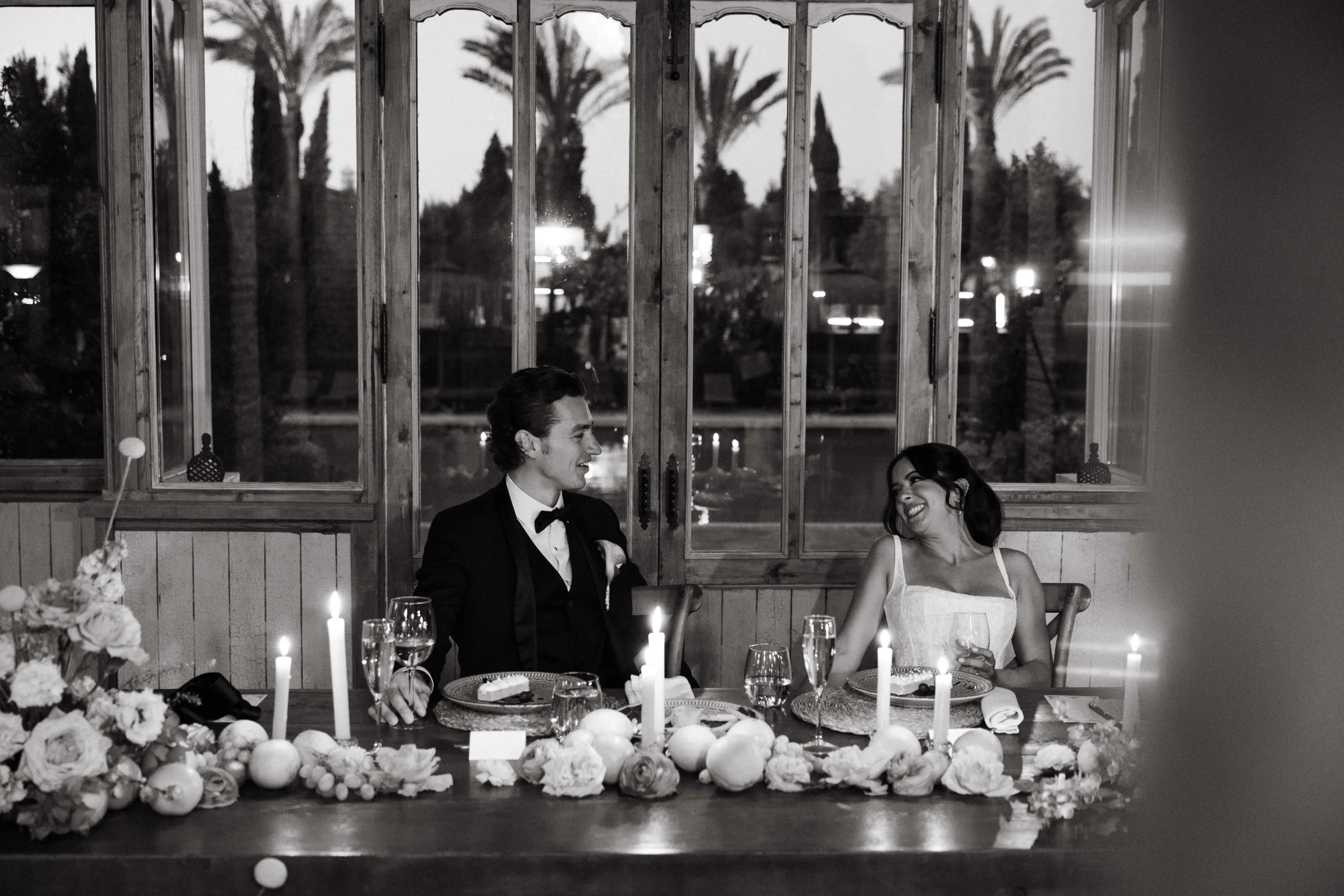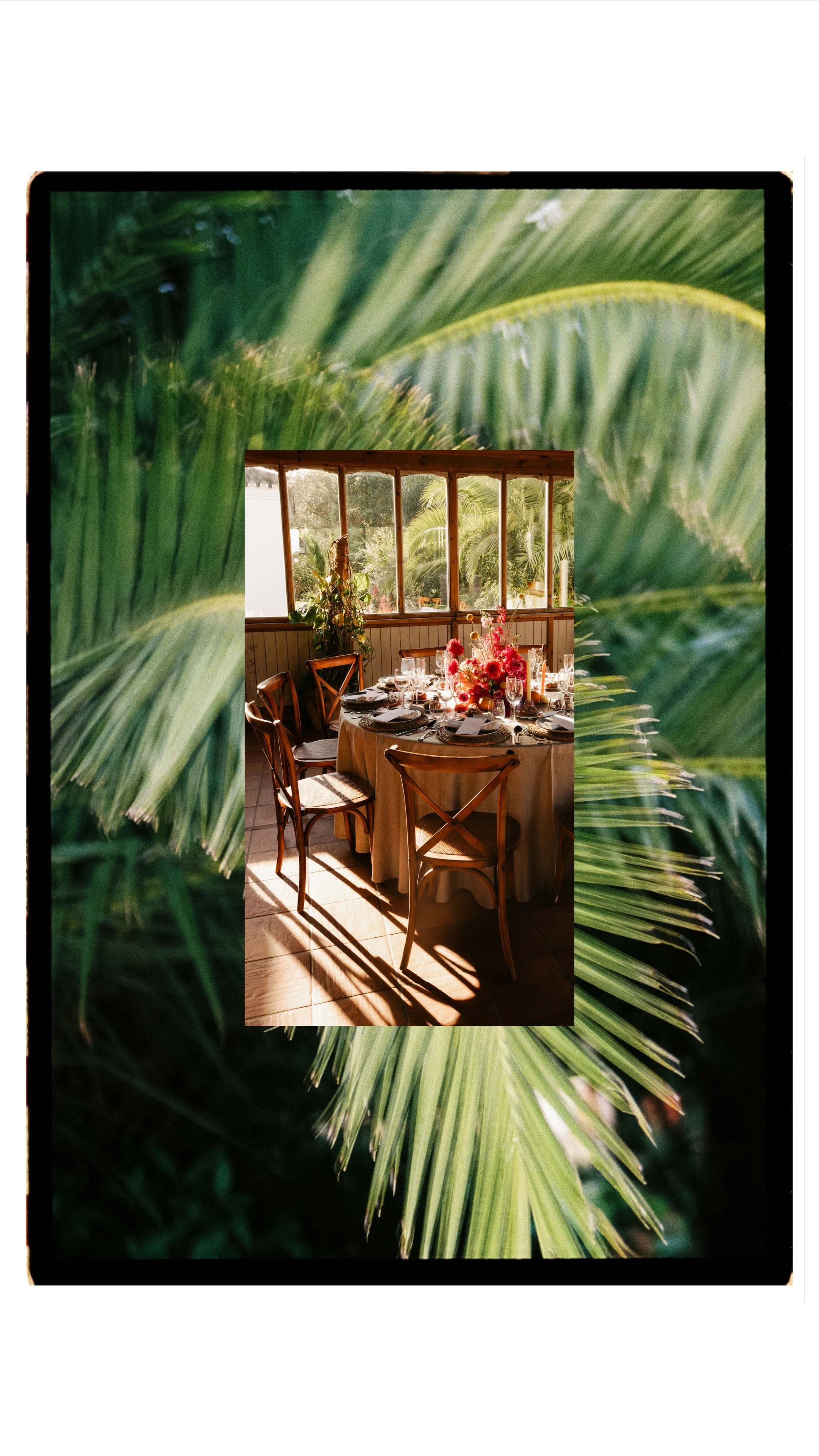Dinner was set in a space that felt almost tropical with the palm trees and the way the light moved through it. The florals carried through beautifully, tying everything together without ever feeling too much. We stepped away briefly for sunset portraits by the pool, just enough time to create something special without pulling them away from their guests for long.
