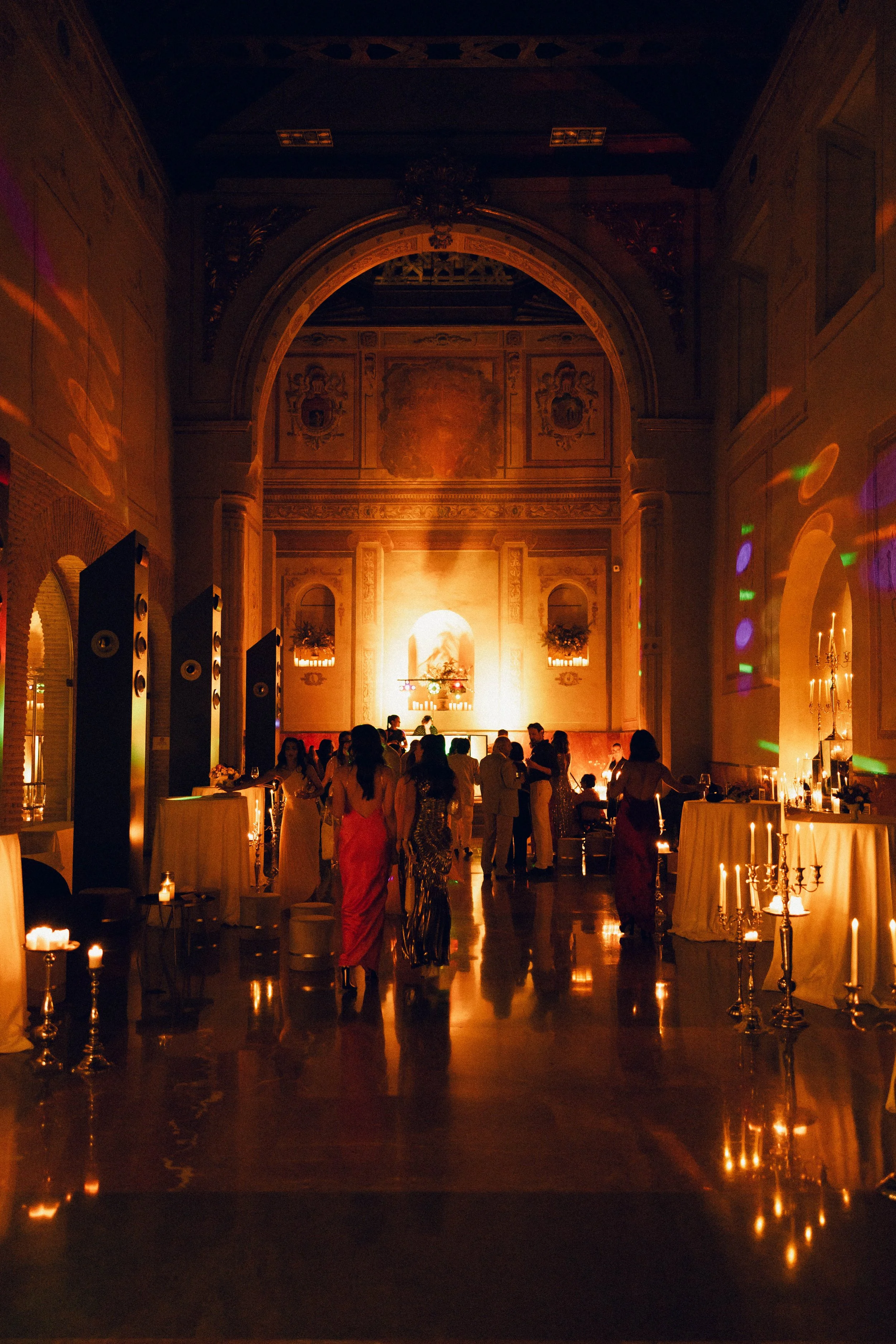 As the last light shifted from sun to candlelight, guests began flowing in, admiring the décor that surrounded the palacio’s beautiful dance floor. The theme for the evening was “The Spanish night” and every detail carried the mood: the food, the flamenco dancers, and the Andalusian music performance that followed Silveen and Dara’s entrance. When the couple appeared, the energy in the room lifted—every guest’s face lit up, eyes fixed on them. They even surprised everyone with a small dance performance on stage, surrounded by hundreds of candles. It was pure magic.